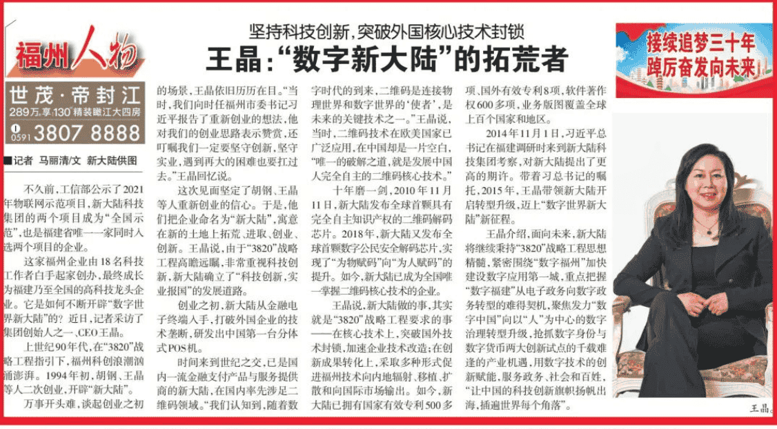 福州晚報5月22日發表專題報道《王晶:“數字新大陸”的拓荒者》,學習強國平臺轉發,新大陸科技集團官微今日全文刊發,以饗讀者。